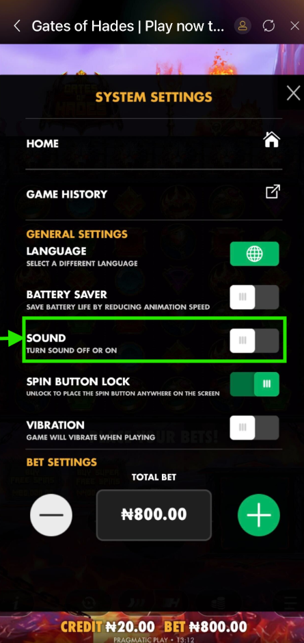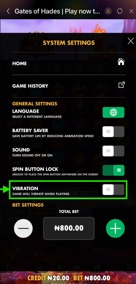 - VIBRATION - Allows to enable or disable vibration when playing the game.