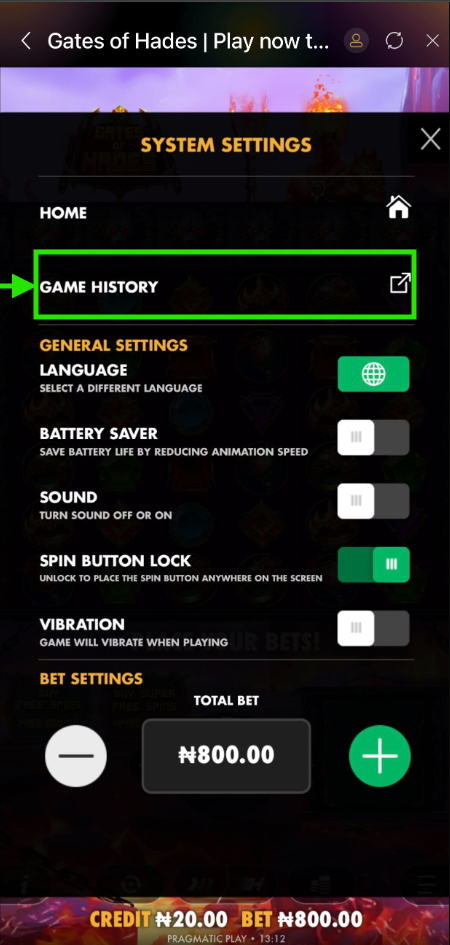 - GAME HISTORY - Allows you to access and review past game rounds.