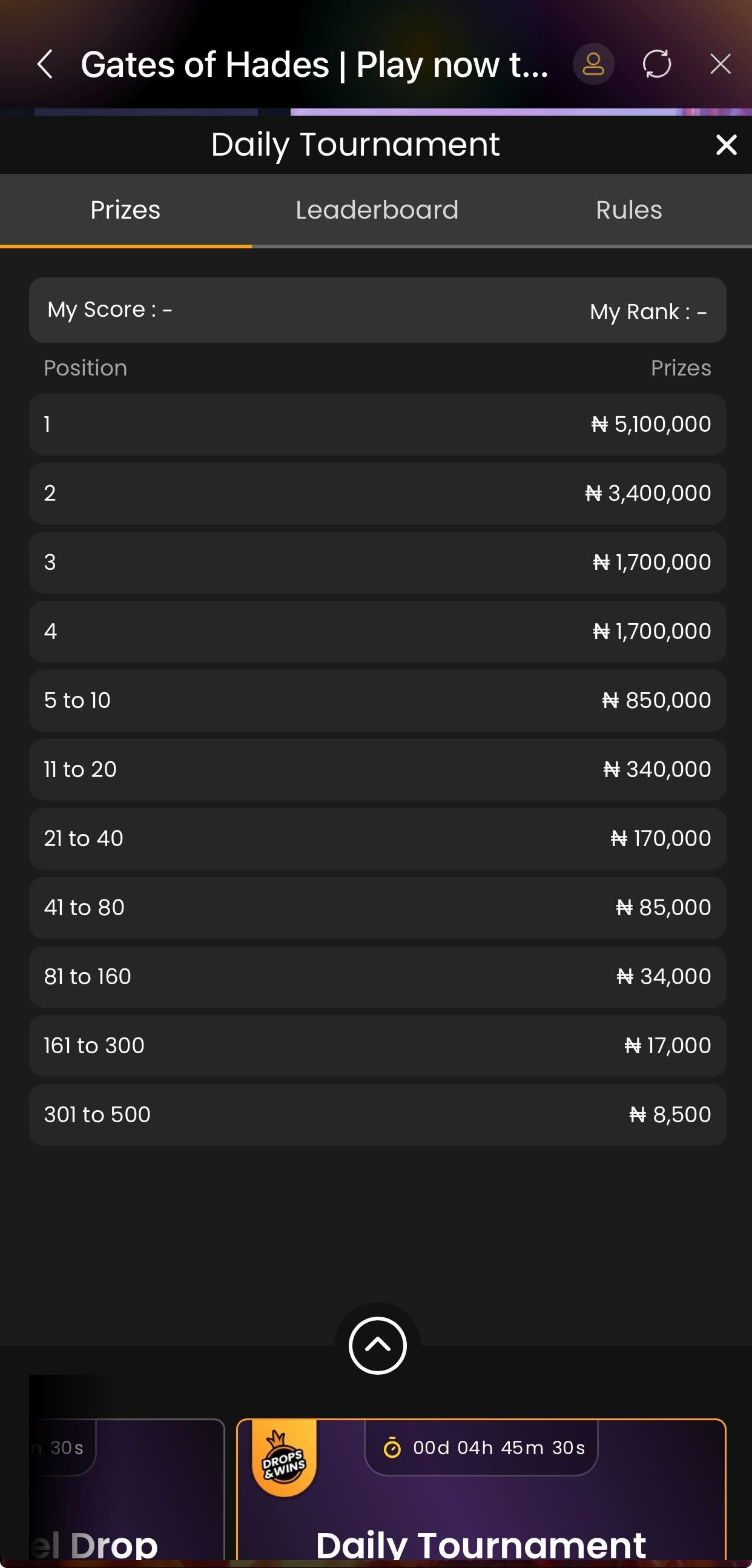 - Prizes will be awarded in cash, based on the final leaderboard positions at the end of each Daily Tournament. Winners are ranked in descending order, from the highest to the lowest position, according to their total score.