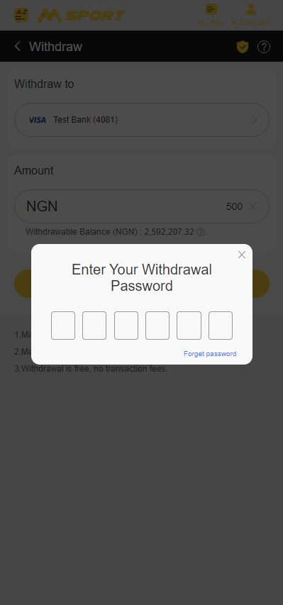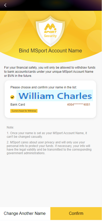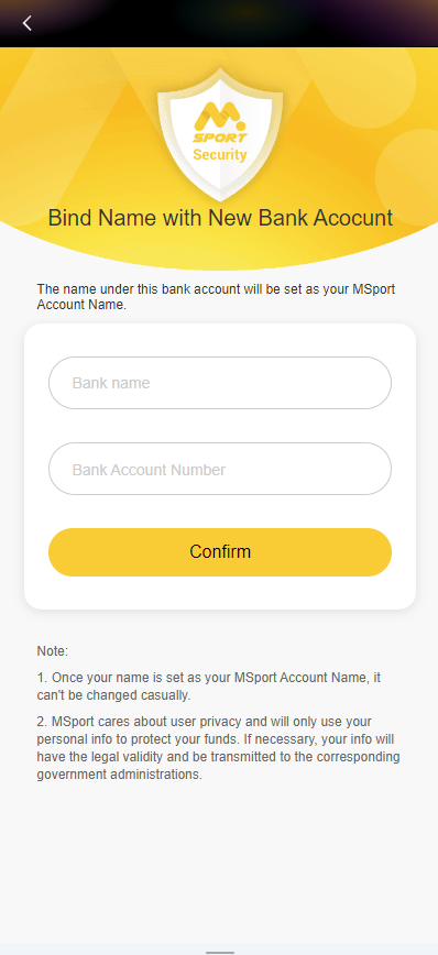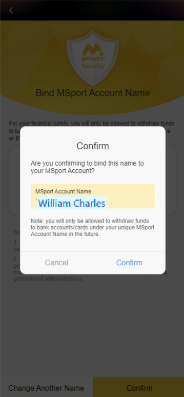 Notice: After you set your MSport Account Name successfully, you can only withdraw your money to an bank account that matches your MSport Account Name. All withdrawals to unmatched bank accounts will be rejected.