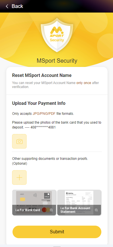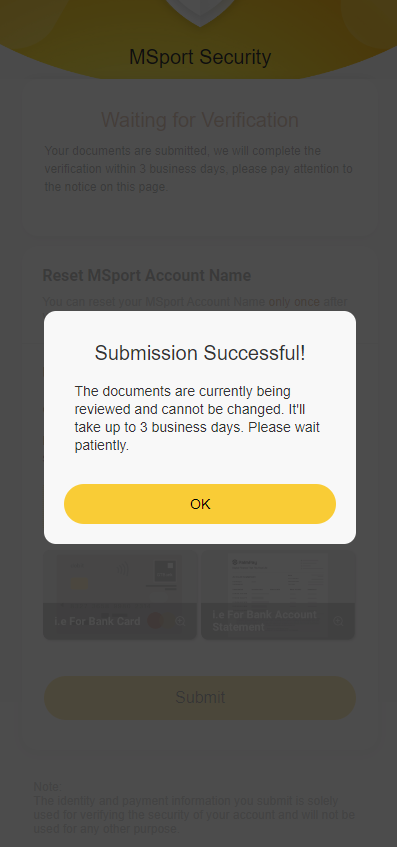 Notice: Within 3 business days, your materials will be reviewed. After they are reviewed successfully, your MSport Account will be reset. Then you can set your MSport Account Name the last time.