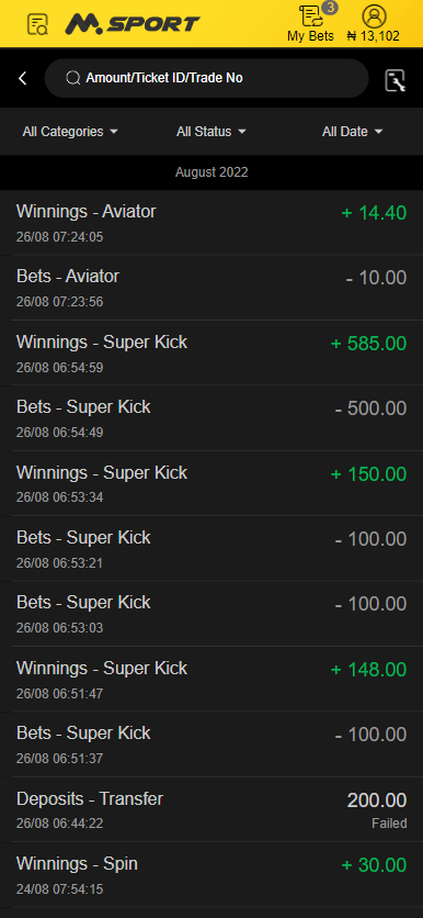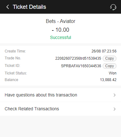 3rd, in the transaction detail page, you will find the ticket id of this aviator bet.